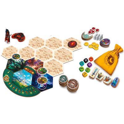 15 piezas de tablero, 1 indicador de Luna, 1 marcador de Astrolabio, 3 fichas de Muro, 1 Escudo de Armas de Avel, 27 monedas, 3 fichas de Sello lunar, 3 fichas de Trampa, 4 tableros de Personaje, 1 folleto con ilustraciones de los personajes, 4 fichas de Personaje, 8 dados de Héroe, 20 marcadores de Resistencia, 1 medidor de Resistencia de la Bestia, 25 fichas de Equipamiento (de doble cara), 31 Monstruos, 5 dados de Monstruo, 10 marcadores de Daño, 4 fichas de Acción, 12 marcadores de Equipamiento Utilizado, 1 bolsa de Equipamiento, 1 apéndice, 1 mapa de constelaciones (de doble cara) y 1 hoja de ayuda de jugador.