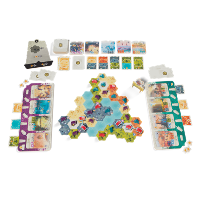 1 marcador de Dewan, 1 cuadernillo de puntuación, 10 piezas de Territorio, 55 cartas de Terreno, 24 piezas de Historia, 5 piezas de Escenario, 15 fichas de Baya, 36 Campamentos (9 de cada color), 4 tableros de Tribu, 1 pieza de territorio de Volcán, 1 pieza de territorio de Diluvio, 20 fichas de Pescado, 8 indicadores de Agua, 8 indicadores de Lava, 1 pieza de Evento