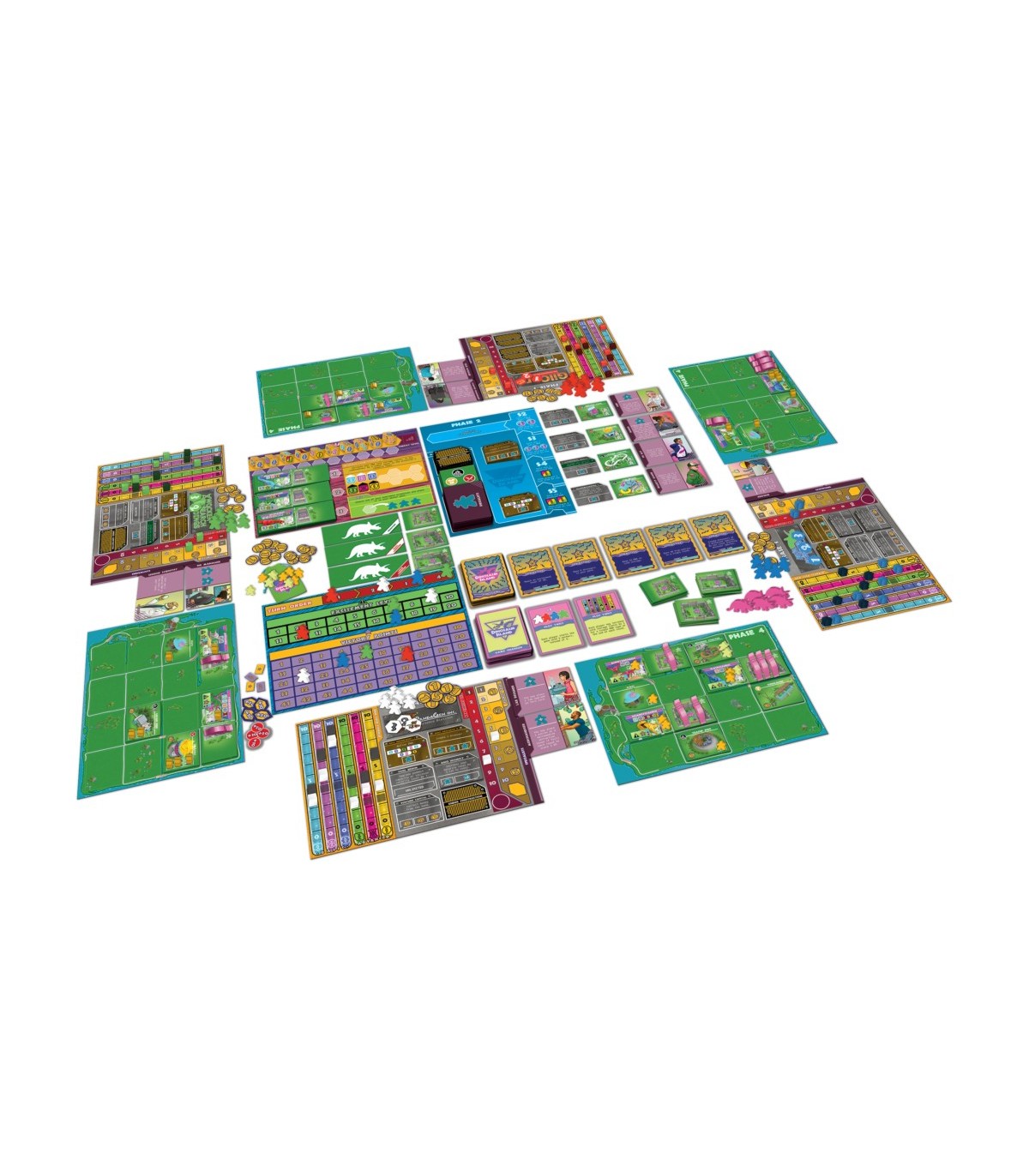 Componentes de altísima calidad con meeples de dinosaurios en 3D y colores vibrantes
