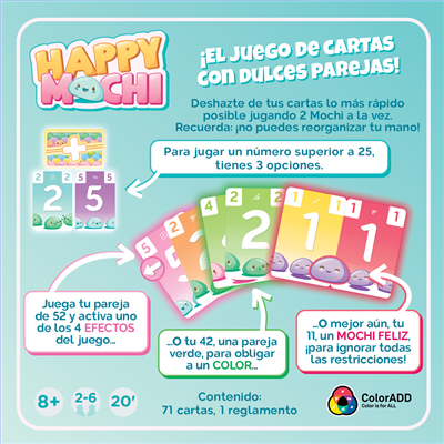 En Happy Mochi tienes que ser el primero en vaciar tu mano y quedarte sin cartas, pero cuidado, ¡que no es tan sencillo como parece! Tendrás que jugar las cartas de dos en dos y está terminantemente prohibido reorganizar tu mano, así que prepárate para darle al coco si quieres ganar la partida en este dulce y estratégico juego tipo party en el que la suerte y la táctica van de la mano.