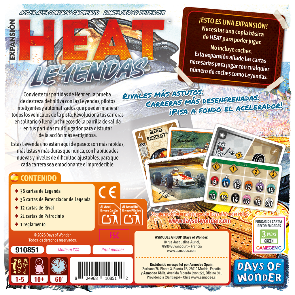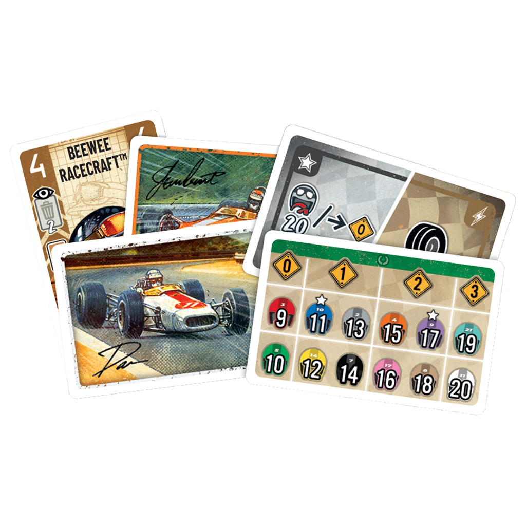 Contenido: 5 tableros de piloto legendarios, 5 miniaturas de coches personalizados, cartas de habilidad especiales, tokens adicionales, reglas de expansión.