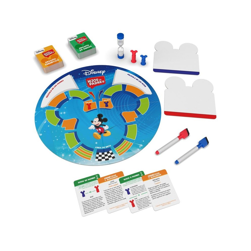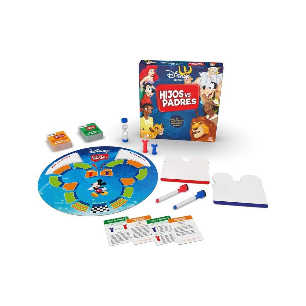 HIJOS VS PADRES ED.DISNEY es el juego perfecto para disfrutar en familia con la magia de Disney. Un emocionante desafío generacional donde padres e hijos compiten en preguntas y pruebas relacionadas con el universo Disney.