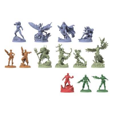 25 miniaturas, 6 módulos de tablero de doble cara, 8 tarjetas de identificación, 35 minicartas, 12 fichas, 1 reglamento